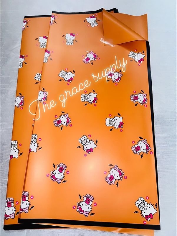 The festive design is printed with a charming all-over pattern of Hello Kitty dressed in various spooky-chic costumes, including an adorable bat-winged vampire and a cute mummy, with a tiny skull accent. The vivid orange background perfectly complements the seasonal aesthetic, making it an excellent choice for autumn celebrations, Halloween gifting, or for anyone who loves to blend traditional “kawaii” with a fun, edgy style. Durable and easy to fold, this paper is ideal for unique gift presentations, DIY projects, or floral wrap.